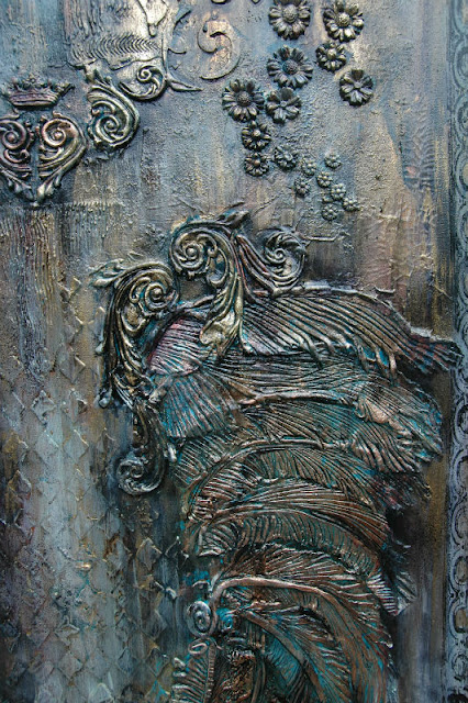 Jednak większa część skrzydeł została zrobiona przeze mnie, ręcznie wycinana z glinki formowana na zasadzie płaskorzeżby, pomalowane akrylami, pozłocone, złotym i miedzianym szlagmetalem i mocno postarzone.